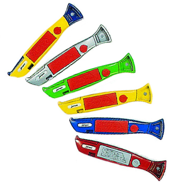 Nóż do cięcia wykładzin dostępny jest w kilku wersjach kolorystycznych, czerwonym, żółtym, niebieskim, zielonym oraz srebrnym.
