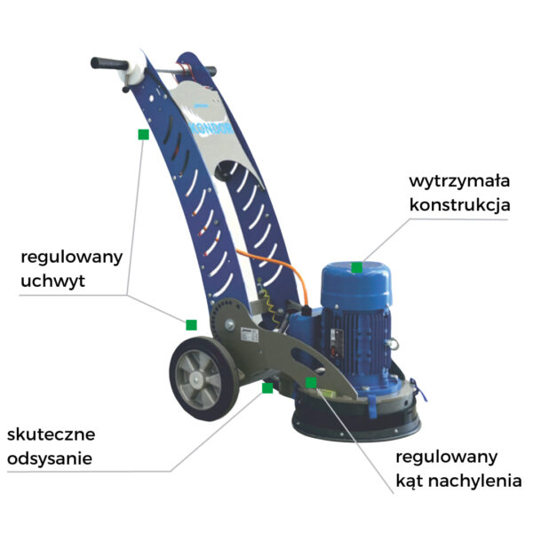 • Regulowany uchwyt prowadzący — zwiększa wygodę operatora szlifierki KONDOR podczas prac.